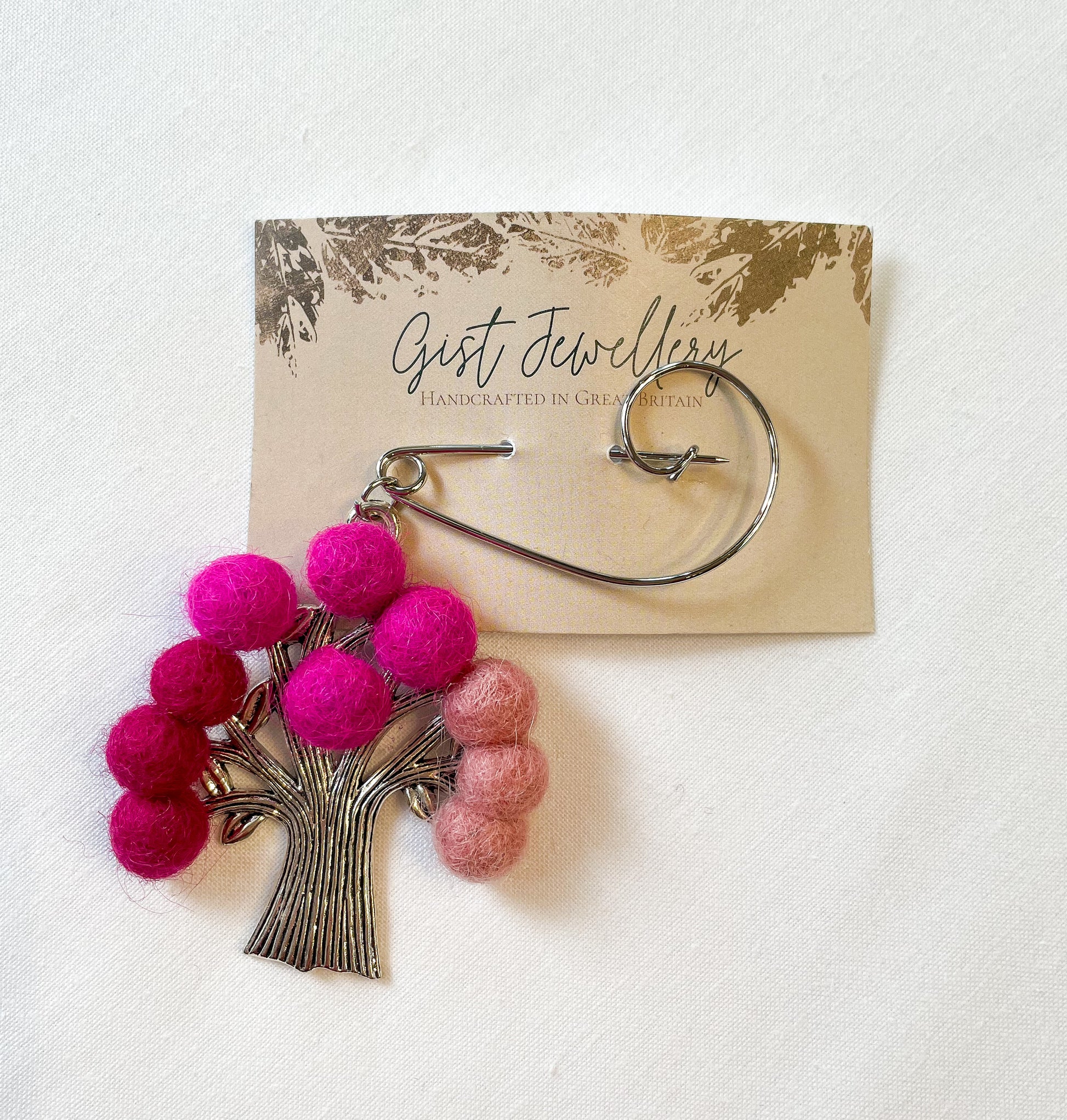 From Gist Jewellery, these colourful tree of life brooches are handmade in Scotland. Silver tone metal tree with blooms made from hand felted wool, on a swirly pin. The brooch pin can be worn either upright or horizontally.